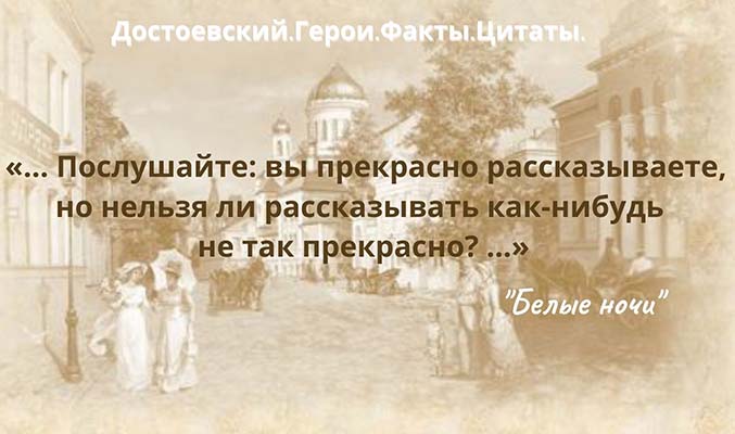 «… Июнь месяц, жара, город пуст; все на даче и живут впечатлениями наслаждаются природою. Есть что-то неизъяснимо наивное, даже что-то трогательное в нашей петербургской природе, когда она, как будто неожиданно, вдруг, выкажет всю мощь свою, все свои силы, оденется зеленью, опушится, разрядится, упестрится цветами... Не знаю, отчего напоминает мне она ту девушку, чахлую и хворую, на которую вы смотрите иногда с сожалением, иногда с какою-то сострадательною любовью, иногда просто не замечаете ее, но которая вдруг, на один миг и как-то нечаянно, сделается чудно, неизъяснимо прекрасною, и вы, изумленный, пораженный, невольно спрашиваете себя: какая сила заставила блистать таким огнем эти всегда грустно-задумчивые глаза, что привлекло кровь на эти бледные щеки, что облило страстью и стремлением эти нежные черты лица, отчего так вздымается эта грудь, что так внезапно вызвало силу, жизненность и красоту на лицо этой женщины, заставило блистать его такой улыбкой, оживиться таким сверкающим, искрометным смехом? Вы смотрите кругом себя, вы чего-то ищете, вы догадываетесь... Но миг проходит, и, может быть, на завтра же встретите вы опять тот же грустно-задумчивый и рассеянный взгляд, то же бледное лицо, ту же всегдашнюю покорность и робость в движениях, утомление, бессилие, глухую тоску и даже следы какой-то бесполезной, мертвящей досады за минутное увлечение. Но к чему сравнения! И захочет ли кто их теперь? Мы переехали на дачи, чтоб пожить непосредственно, созерцательно, без сравнений и взглядов, насладиться природой, отдохнуть, полениться вдоволь и оставить кой-какой ненужный и хлопотливый житейский вздор, и хлам на зимних квартирах, до более удобного времени…»